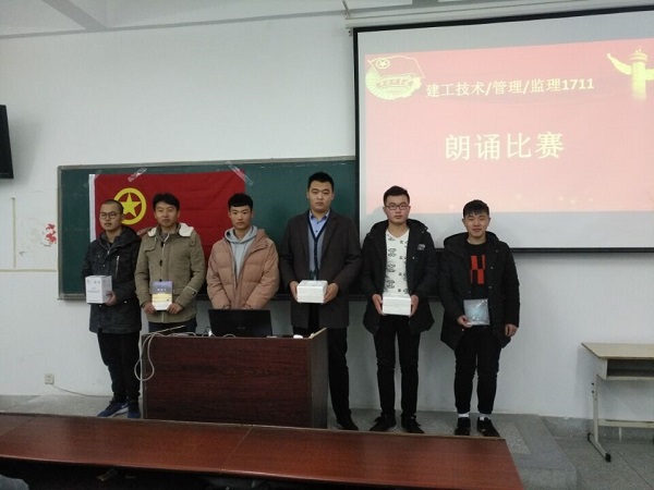 活动采用“1+1”的形式展开,即一次党的十九大精神班级宣讲会,加一次党的十九大精神践行活动。在班级宣讲会中,各团支部书记广泛通过各种渠道收集、学习党的十九大内容,制作精美的宣讲PPT,以青年学生的视角为大家普及党的十九大知识,解读党的十九大,号召同学看清形势、认清使命、明确目标。随后,各团支部结合本支部实际情况,开展了形式多样,精彩纷呈的践行活动,将党的十九大精神通过自己的实际行动表达出来。造价1731团支部开展了“冬至送温暖,十九亮人间”走访敬老院的活动,将爱心送给孤寡老人,用温情点亮社会,做社会主义的合格青年;建工1711团支部开展了党的十九大精神朗诵比赛,通过慷慨激昂的诵读传递爱国情怀;造价1711团支部开展了党的十九大观后感征文活动,将家国情怀展现于笔墨之间。其他团支部还开展了如红歌传唱、参观红色景点、知识竞赛、一人一笔手抄报等活动。