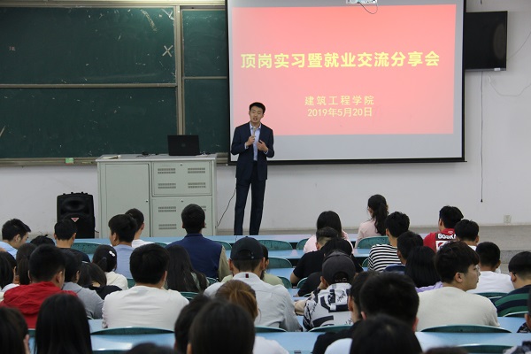 2019年5月20日下午,建筑工程学院在公共教学楼2203教室举行顶岗实习暨就业分享交流会,建筑工程学院团总支书记周伟,辅导员曹菊、颜振亚,全体大一学生、大二部分学生参加会议。