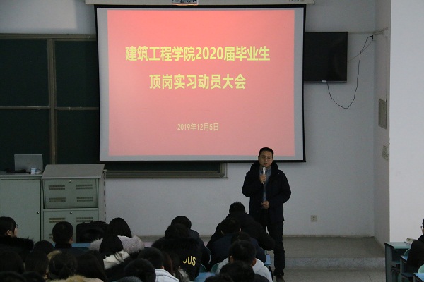 2019年12月5日,建筑工程学院2020届毕业生顶岗实习动员大会在阶梯教室2404举行。建筑工程学院院长赵华玮、党总支副书记张国兵、副院长胥民尧、全体顶岗实习校内指导老师和2017级学生参加本次会议。会议由胥民尧主持。