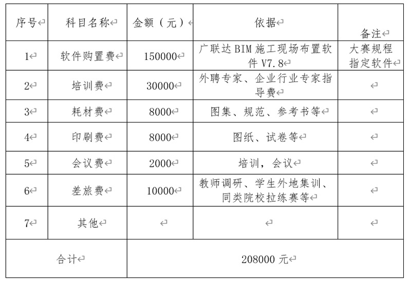 根据2021年江苏省职业院校技能大赛高职组建筑信息建模与应用赛项(JSG202103)赛制要求,技能竞赛内容为建筑工程施工图和BIM模型识读、建筑工程施工图绘制和建筑信息模型建模三部分组成,含工程施工图识读和绘制任务。本次建筑信息建模与应用备赛所需费用包括软件购置费(大赛规程指定软件)、集训学生培训费用、日常训练耗材费用、图纸打印费用等。具体费用清单如下: