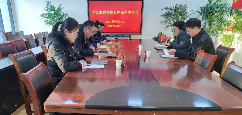 12月30日下午,建筑工程学院党总支在创业园102会议室召开党风廉政建设专题民主生活会。校纪委办公室副主任赵红军,马克思主义学院纪检委员、副院长贾妍春到会督导。建筑工程学院党总支委员全体成员参加会议,院长胥民尧列席会议,会议由党总支书记张国兵主持。