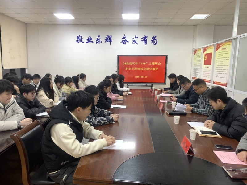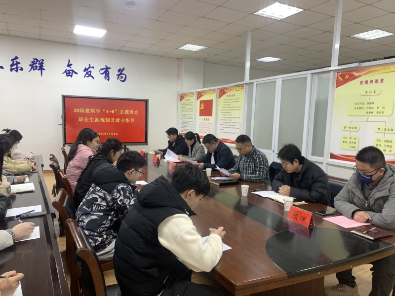 12月4日,建筑工程学院在学院102会议室召开2020级建筑学“4+0”“职业生涯规划及就业指导”主题班会。2020级建筑学“4+0”班全体学生参加了本次活动。学校后勤管理处处长张立峰,建筑工程学院院长胥民尧,党总支副书记、副院长付佳佳,辅导员顾洋和教师戴阜参加会议。会议由班主任沈俊宇主持。
