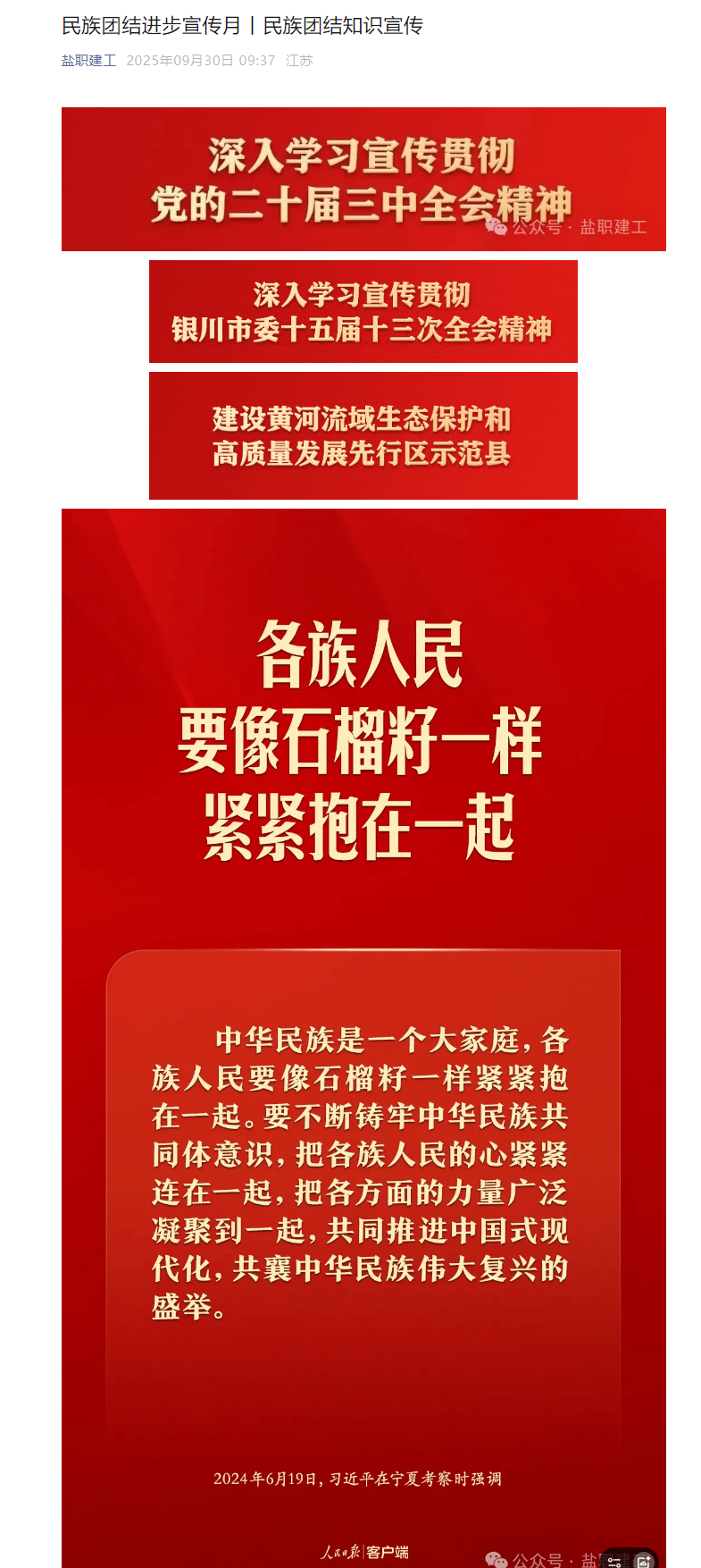 拓宽宣传阵地,营造浓厚氛围。在民族团结宣传月期间,学院充分利用“盐职建工”微信公众号推送相关专题,拓展了教育辐射范围。同时,2025级各新生班级积极召开“石榴花开别样红”主题班会,通过案例剖析、互动研讨等方式,生动解读“像石榴籽一样紧紧抱在一起”的深刻内涵,引导学生从身边小事做起,争做中华民族共同体意识的积极传播者和践行者。